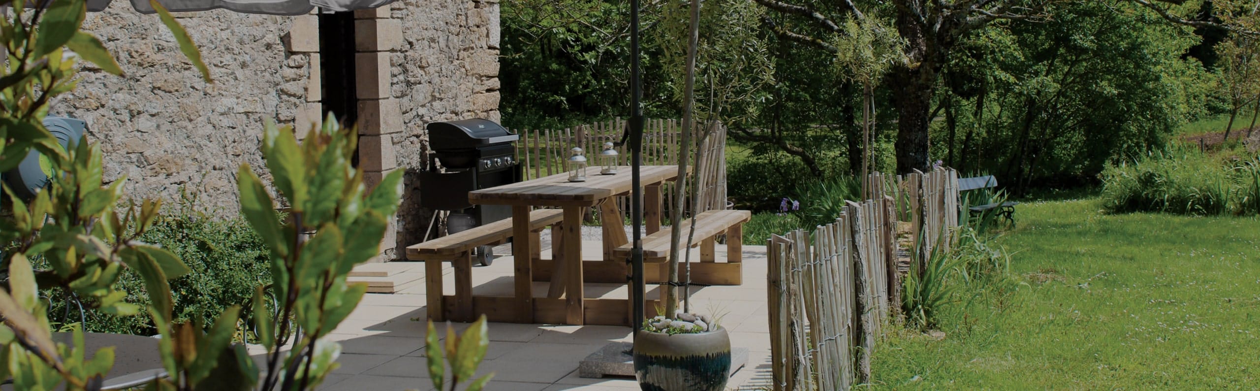 La terrasse du gîte est idéalement aménagée pour partager un bon repas en famille ou entre amis ou se détendre à l’ombre grâce à de grands parasols.